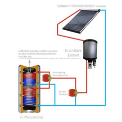 - Der Behälter, die sogenannte Drain-Back-Einheit, welche das Wasser aus den Kollektoren aufnimmt, muss über dem höchsten Wärmetauscher im Pufferspeicher gebaut werden.