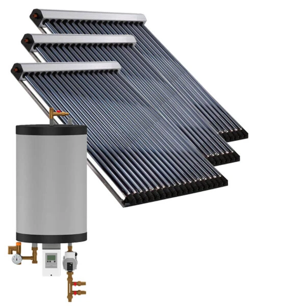 Bei diesem Set kann der Installationsaufwand auf dem Dach geringgehalten werden. Mit nur drei Kollektorfelder von je 3,11m² und zusammen 54 Röhren insgesamt ca. 9 m² Fläche installiert werden. Der Platzbedarf hält sich dabei in Grenzen. Vorteil bei dieser Art von Kollektoren ist es, dass der Rahmen vor Ort auf dem Dach zusammengebaut werden kann. Erst anschließend werden die Röhren in den Sammler montiert und mittels einer Schuhkappe am Kollektor fixiert.