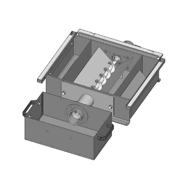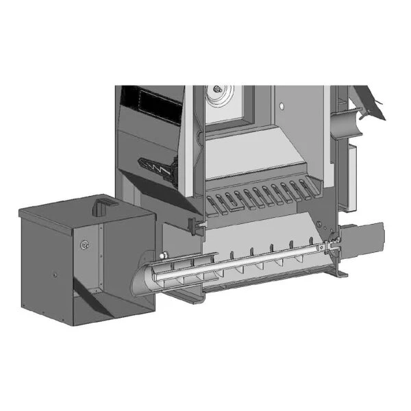 Die automatische Ascheaustragung für den Atmos Pelletkessel besteht aus einem Aschekasten, einer Förderschnecke mit Getriebe und einem Steuermodul. Dieses kann unter dem Schaltfeld am Pelletkessel montiert und angeklemmt werden.