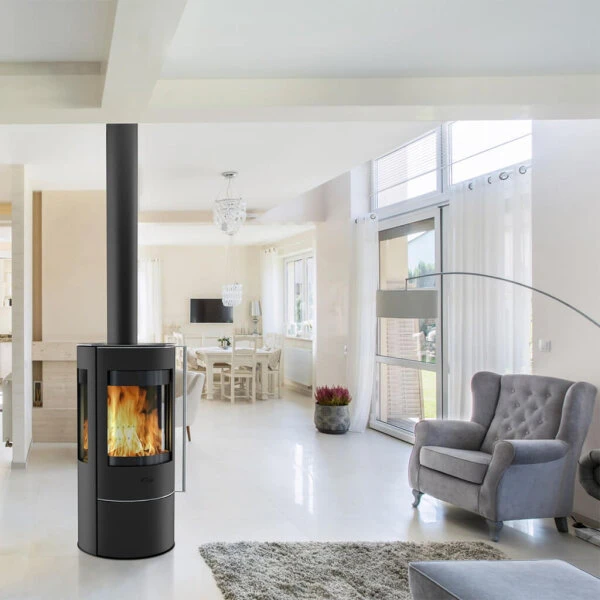 Das Design kennzeichnet sich vor allem durch die runde Form des Ofens. Ein schwarzer Stahlkorpus wird durch Glas auf drei Seiten des Gerätes ergänzt. Besonders luxuriös wirkt der großzügige Blick auf das Feuer, welcher durch diesen großen Glasanteil ermöglicht wird. Die lange Griffstange an der Tür sorgt für einen interessanten Akzent.