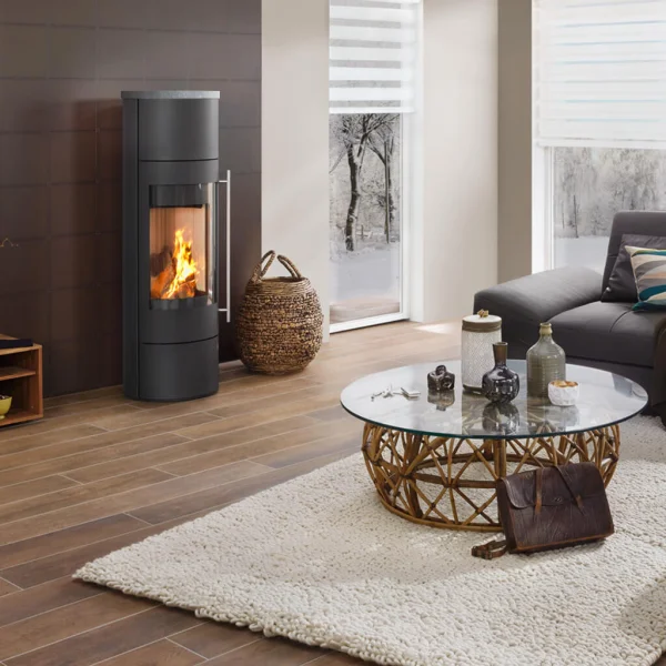 Der 151 cm hohe Kaminofen Olsberg Palena PowerBloc! Compact hat eine runde Grundfläche und ist mit einem Durchmesser von schlanken 47 cm eine elegante Erscheinung. In seiner Mitte befindet sich die Brennkammer, auf die Sie dank einer großzügigen gebogenen Sichtscheibe einen hervorragenden Blick haben und das Feuer in seiner ganzen Schönheit genießen können.